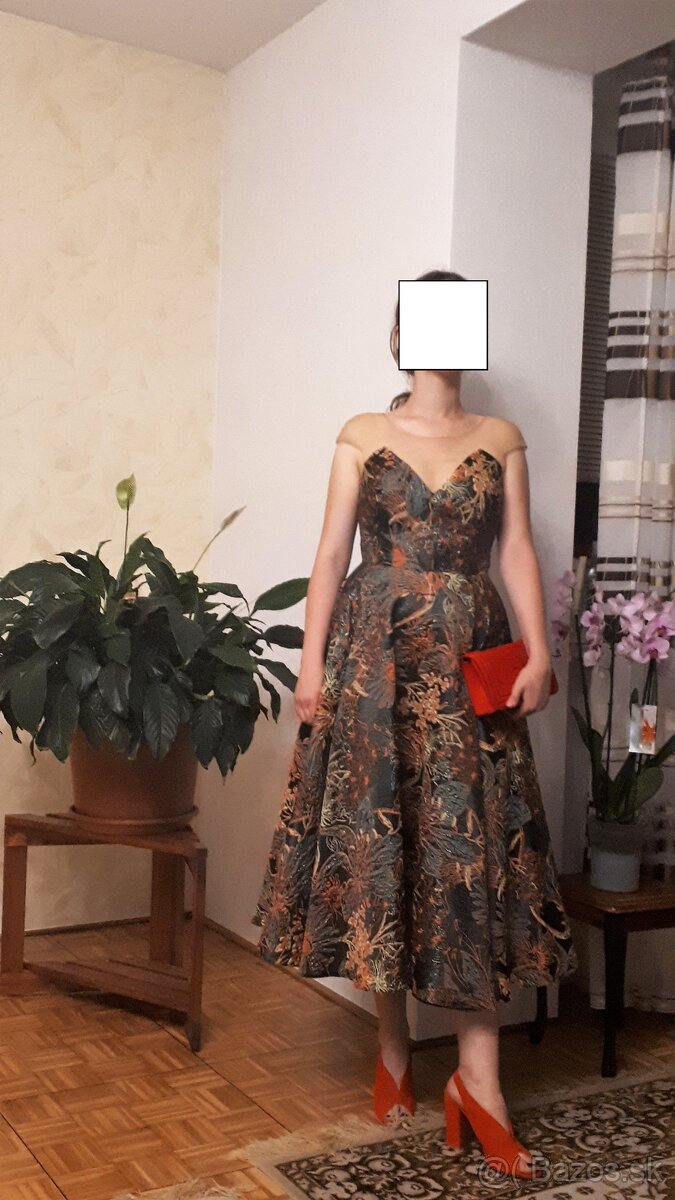 Predám spoločenské šaty, tmavo zelená metalíza s oranžovým a žltým vzorom, výstrih prekrytý tylom v telovej farbe, veľkosť 38 - 40, raz použité, profesionálne vyčistené. Od španielskej dizajnérky Carla Ruiz. Pridám v prípade záujmu aj tieto oranžové sandálky č. 39 zn. Top Secret, v cene.