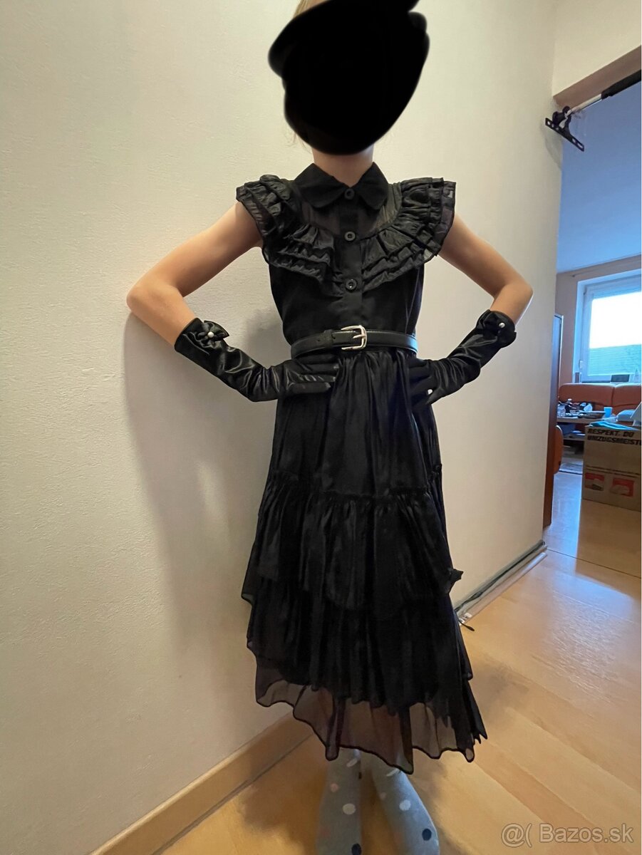 Krásne šaty na karneval (wednesday) Raz oblečené v top stave ako nové. Dokupovala som k tomu rukavičky (nové) a bolérko. Bolerko je kupované na koniku a tak už má žmolky ale na karneval poslúžilo aby dcére nebola zima. Celková dľžka šiat je 90cm. Predávam to komplet. Veľkosť 134/140
