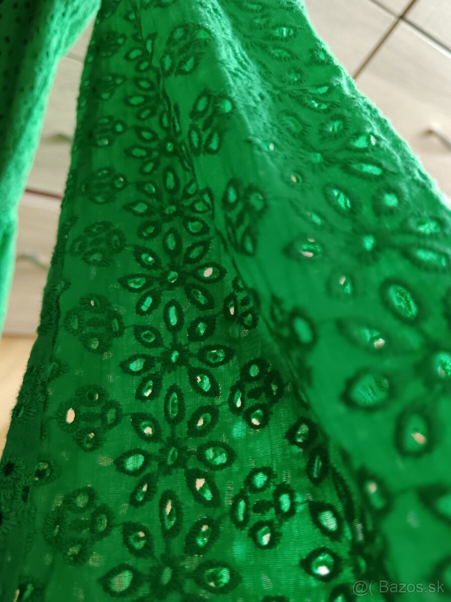 Krásna svetlá zelená, rukávy sú nepodšité. Ostatné jemne podšité, takže nepresvitajú. Veľkosť M. Ale sú voľné takže kľudne aj L.