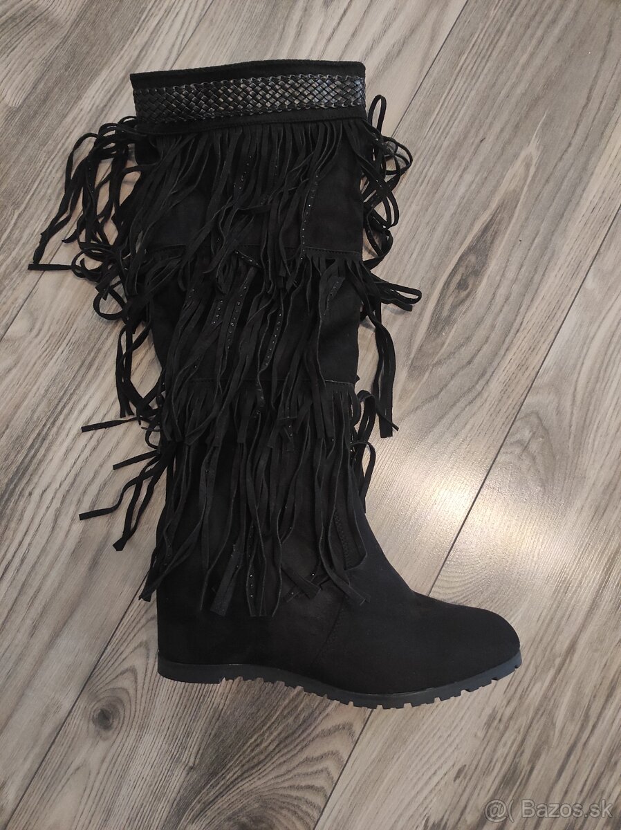 Predam nove damske cizmy na klinovom opätku,ciernej farby,semisove so strapcami.vhodne aj k satam.15e+postovne.dlzka vlozky 25cm.