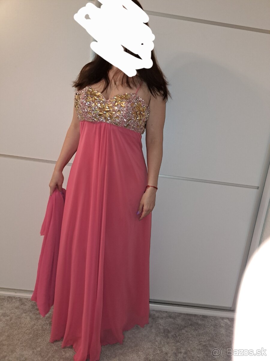 Predám raz oblečené dlhé ružové (fuchsiova) slávnostné saty s nádhernou kamienkovou výšivkou, štóla k tomu, veľkosť S/M,pomeriam, pôvodná cena 150eur, luxusný salón. Mala som ich len po polnoci na svadbe, ako nové. Ps: na fotke ich už nezapnem a mam výšku 168cm