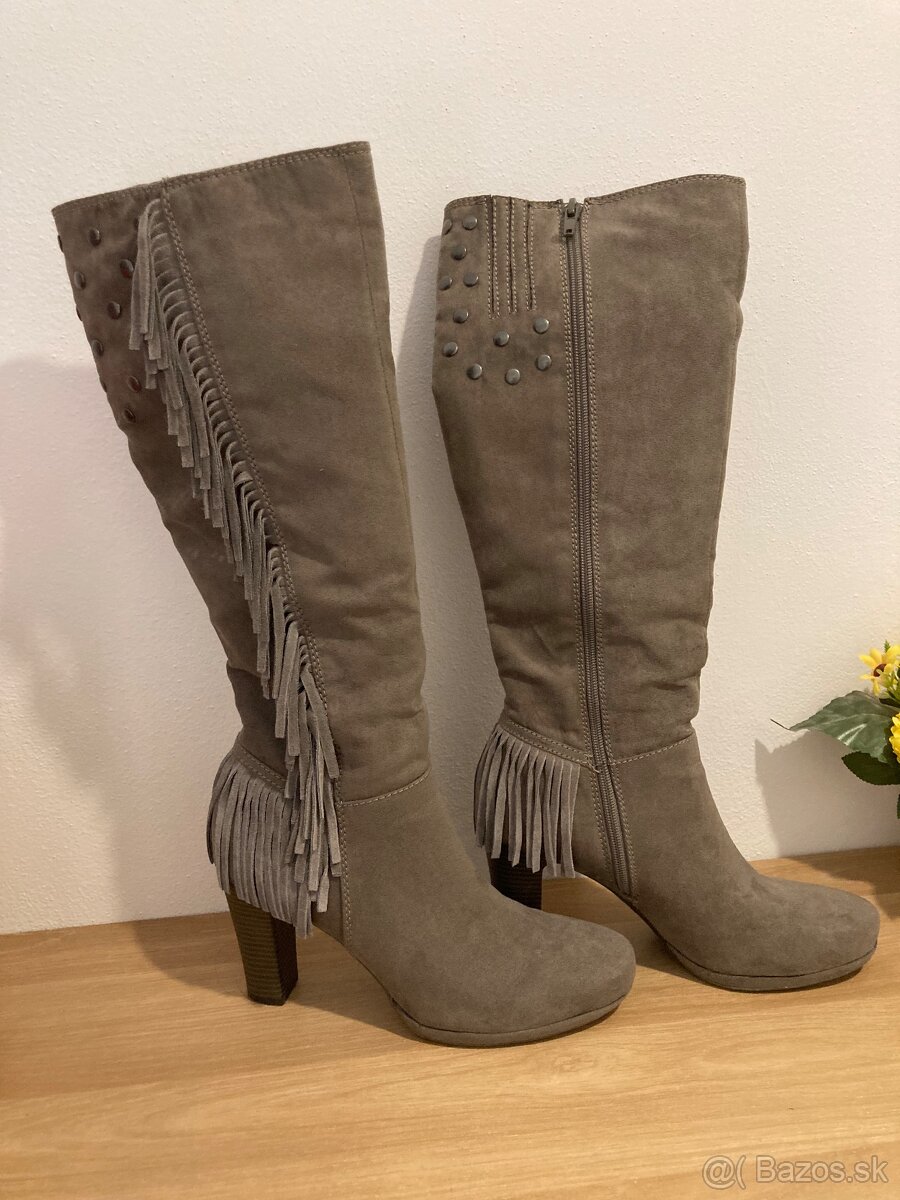 Predám vysoké sivohnedé čižmy so strapcami, ,veľkosť 40, vzhľad brúsenej kože, párkrát obuté, vhodné na štíhlejšie nohy. Výška opätku 8-9cm, platformy 1 cm, obvod sáry 37,5-38,5 cm. Cena 10€ plus poštovné. Pozri moje ďalšie kúsky ;-)