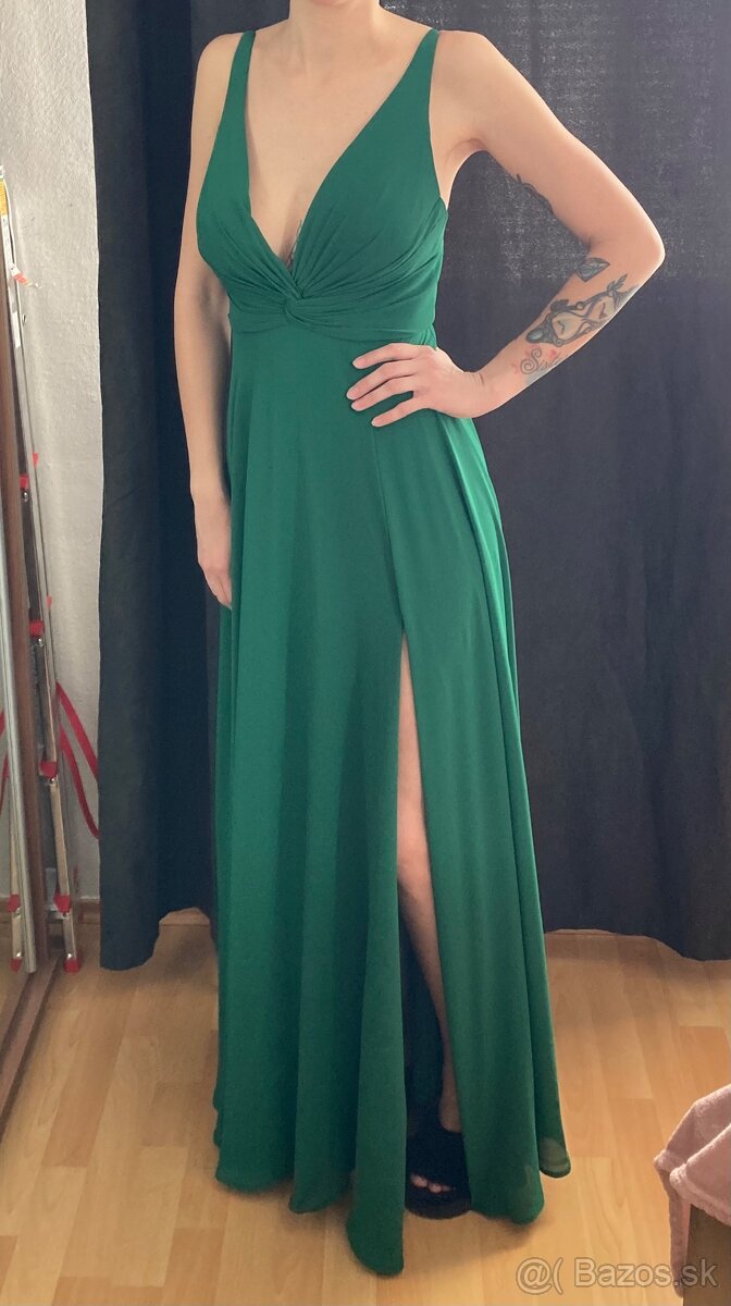 Predám kvalitné zelené šaty na spoločenskú udalosť, boli oblečené iba raz. Prsia sú vystužené, veľký výstrih vpredu aj vzadu. Boli upravené na mieru. Sedia na Xs/S. Dĺžka je tiež upravená na výšku 163 cm + 10 cm opätok. Kúpené v obchode Zaira SC (pôvodná cena 120€)
