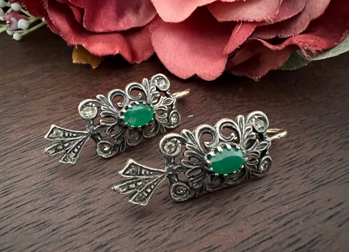 Krasne velmi stare stieborne nausnice zo Spanielska . Maju drobne starozitne biele zafiry a v strede je smaragd. Hacik do ucha je pozlateny 18k zlatom ktore sa pouziva v Spanielsku , nausnicky su stare okolo 80 rokov.