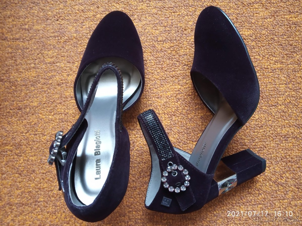 Vrchný materiál (zamat) a vnútorná stielka syntetika, podrážka syntetika. Veľkosť dokonalá 38. Farba čierna. Ozdobné pracky. Opätky vykladané kamienkami. Nové, nenosené. Zn. Laura Biagiotti