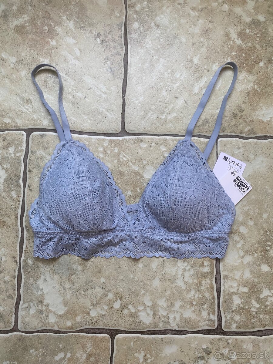 V ponuke nová, s pôvodnými visačkami (ako na foto), čipkovaná bralet podprsenka v krásnej modrej farbe z H&M. Veľkosť M, aj sedí. Kupovaná v plnej cene, nie vo výpredaji. Nakoniec nevyužijem.