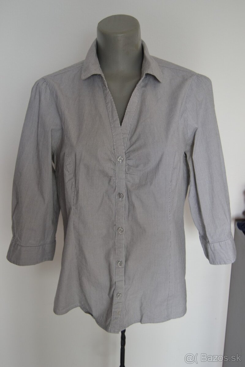 Dámska blúzka s jemnými prúžkami bielo čiernymi s 3/4 rukávmi, veľkosť 46, obvod cez prsia 104 cm, dĺžka rukávy 43 cm.