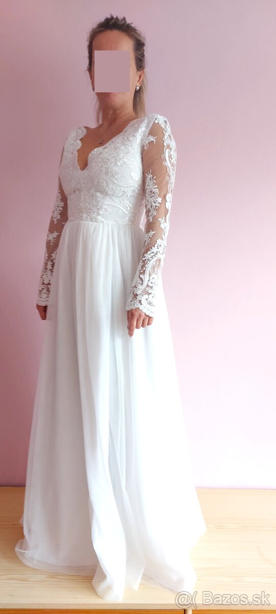 ...svadobné šaty, oblečené boli 4 hodiny počas svadobného obedu, veľkosť S, dĺžka 155 cm, hrudník 84 až 90 cm, pás 70 cm, vrchná časť krajka, sukňa tyl, s rozparkom, vyčistené, inzerát platí do zmazania.