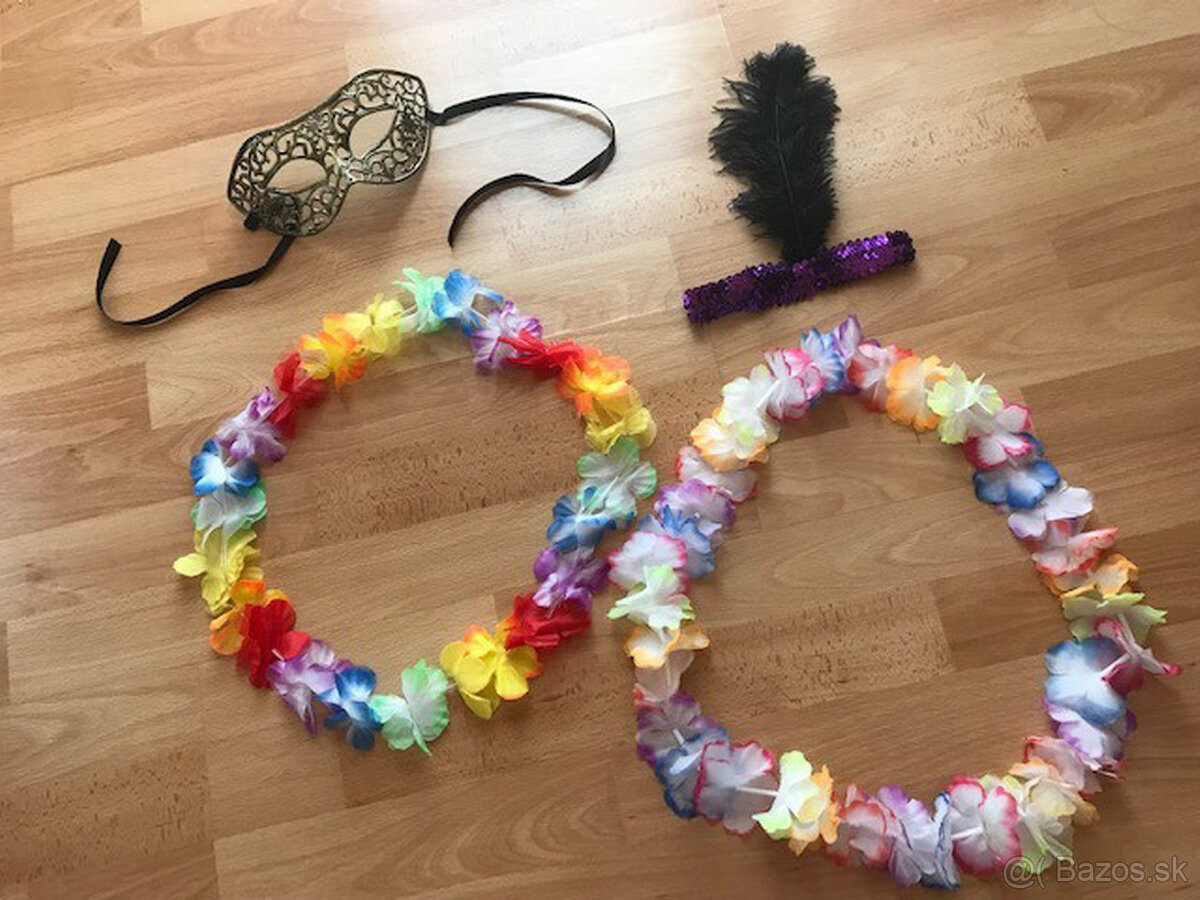 Set obsahuje: karnevalovú masku (škrabošku) na tvár, charlestonová čelenka (čelenka s filtrami a perím), 2x havajský veniec