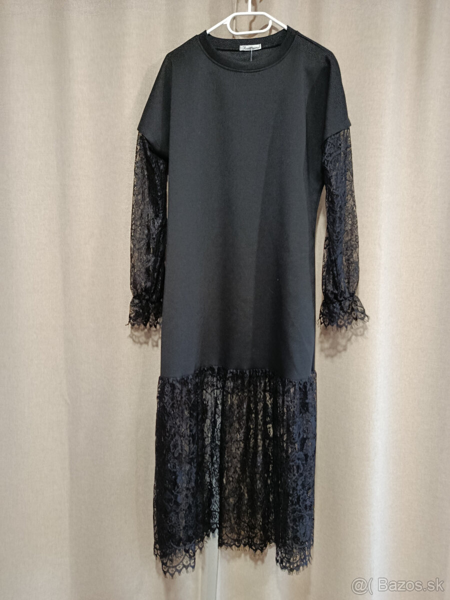 Čierne dlhé šaty s čipkou, krásne, veľkosť uni, dĺžka 131 cm, prsia cca 48 cm v nenatiahnutom stave, s visačkou, materiál 55% viskóza, 40%polyester, 5%eleastan = akoby mikinkový materiá, super sú.