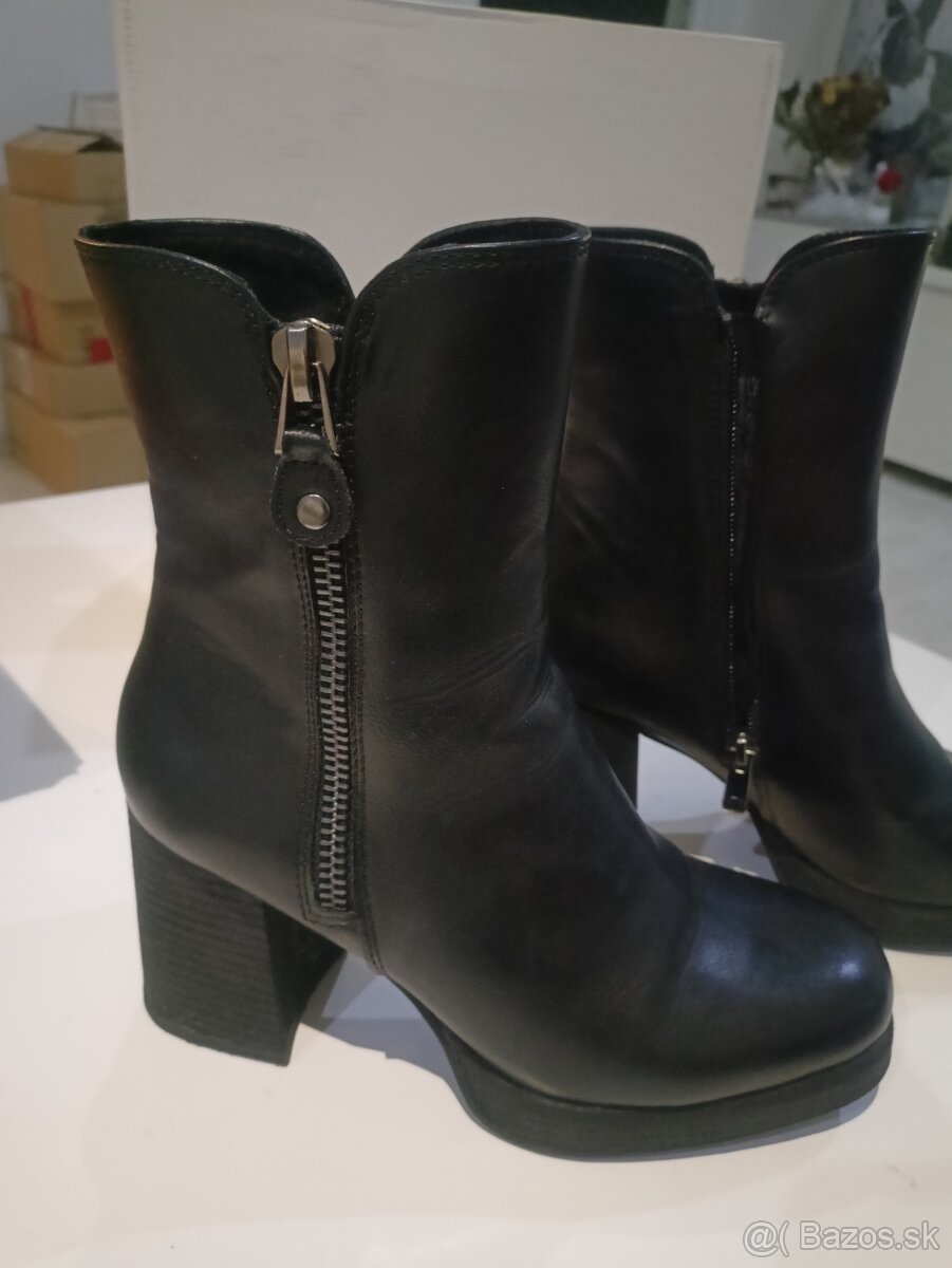 Čierne kožené čižmy č. 38 - [4.2. 2026]Predám tieto čierne kožene dámske členkové topánky od značky Wojas. Sú dokonalým spojením kvality, designu a pohodlia. Opätok je farebne zaujímavý, prechádza od čiernej až po bežovú farbu. Obuté pár krát, mám aj originál krabicu.