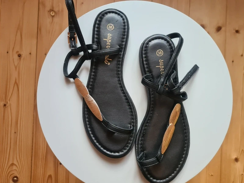 Čierne nízke sandále so zlatou ozdobnou aplikáciou. Na klasické zapínanie okolo nohy s aplikáciou na palec. Veľkosť 38 . Nenosené, len zakúpené.