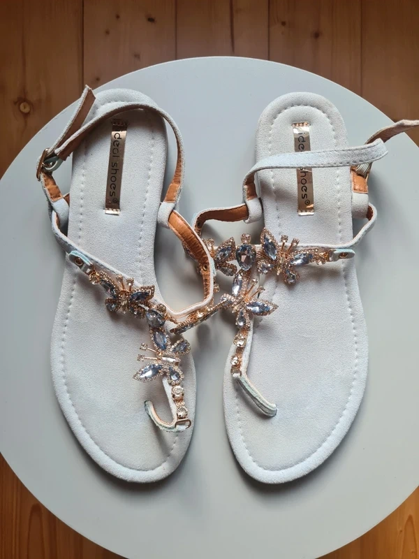 Nízke sandále s ozdobnou kamienkovou aplikáciou na prednej strane. S klasickým zapínaním vo veľkosti 38. Obuté boli iba pár krát, bez poškodenia.