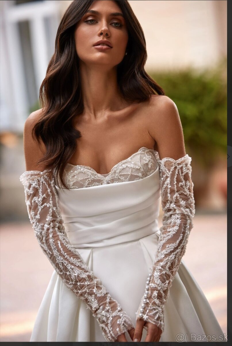 Svadobné šaty sú nové. Krásne sedia na postave. Odskúšané len v salóne. Veľ. 38-40. Dľžka pôvodná takže aj na vysokú nevestu. Majú osobitne rukavičky na gombíky.