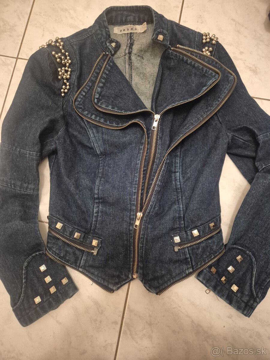 Predám krásnu modrú riflovú bundu zo zipsami a perličkami vel.S,top stav, značka Rehab,cena 13€