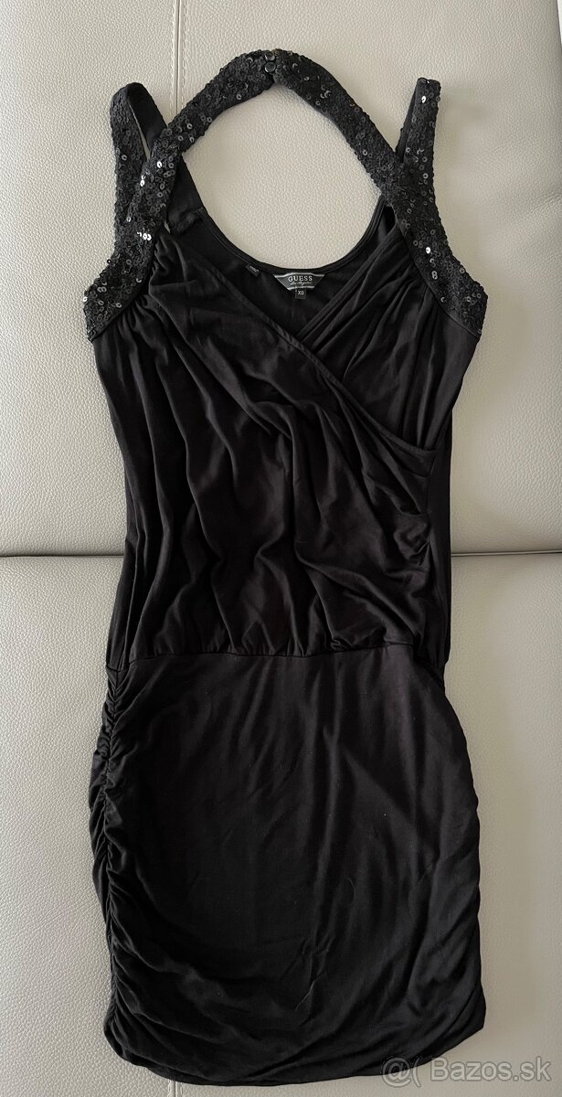 Predám čierne šaty Guess veľkosť XS. Robia veľmi peknú postavu vďaka riaseniu na boku. Príjemný a jemný materiál, šaty sú obtiahnuté ale pohodlné. Šaty majú flitrové zdobenie na ramienkach a okolo krku. Super stav, párkrát oblečené, bez poškodení. Cena 13 € plus poštovné.