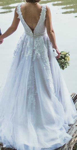Predám krásne svadobné šaty s vlečkou a V-čkovým výstrihom (vpredu, aj vzadu), šité na mieru. Šaty majú niekoľko vrstiev, sukňa preto pôsobí veľmi bohato; pod vrchnou tylovou vrstvou je saténová látka vo farbe champagne. Šaty sú vhodné na postavu veľ. 34-36, zapínanie na zips. Bližšie info správa. Prosím, kontaktovať len mailom!