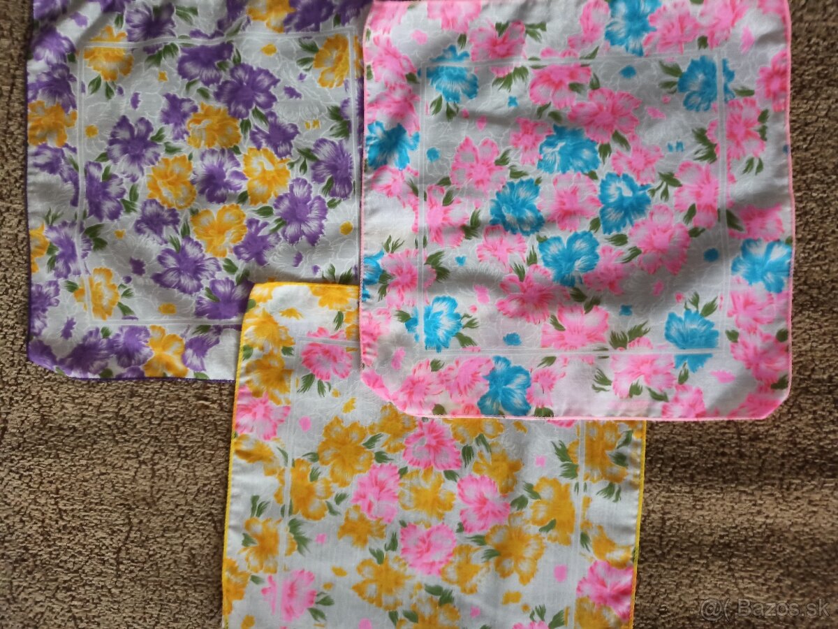 Predám dámske retro vreckovky, tri sady po 4 kusy. Cena za jednu sadu 2€. Predám biele,veľké, pánske vreckovky, 6 kusov, cena 8€. Predám nové bavlnené utierky z čias socializmu, slovenskej a ruskej výroby. Iba všetky spolu,