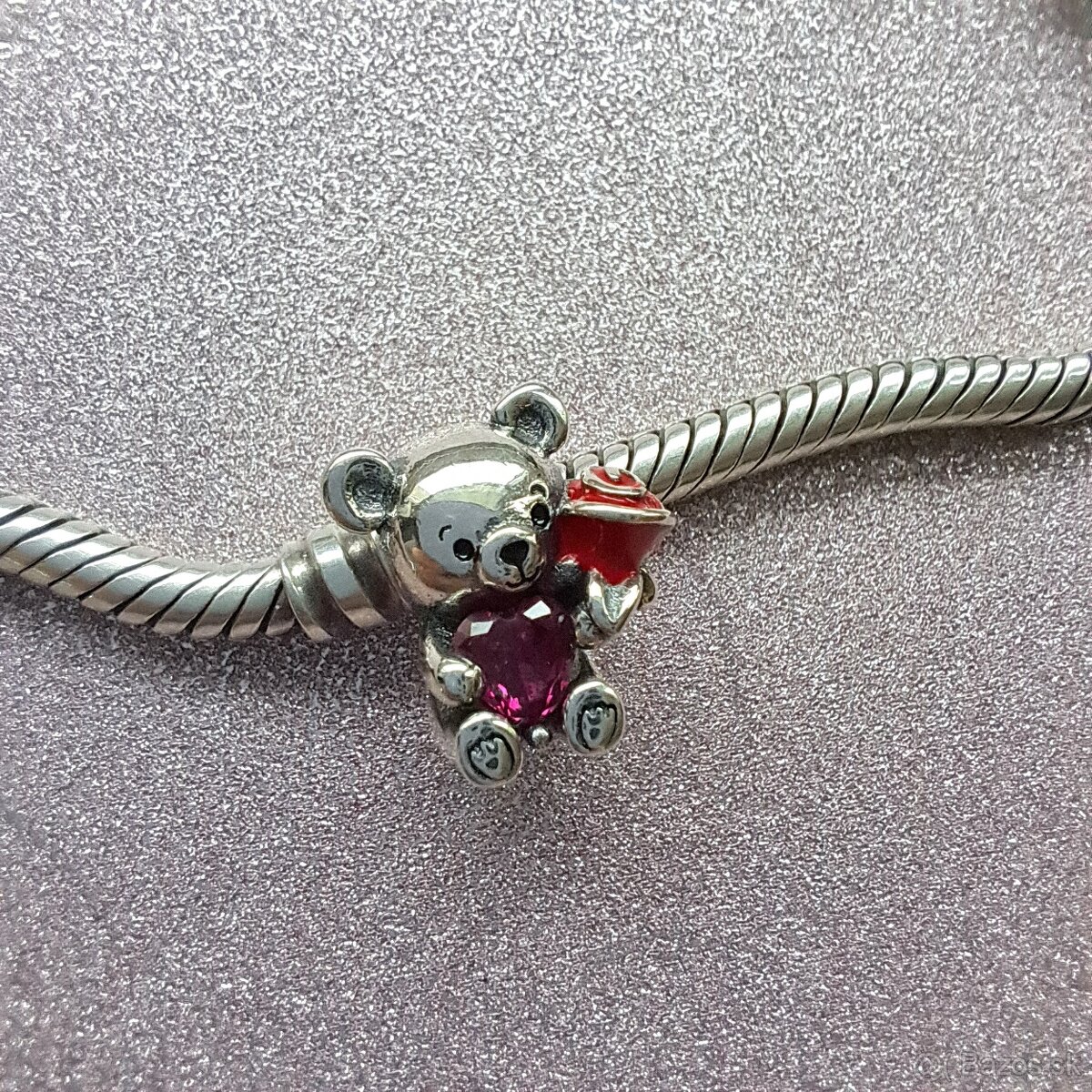 Krásny prívesok korálka v tvare medvedíka so srdiečkom a ružou.
