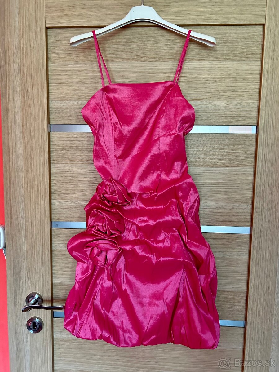 Predám nové spoločenské šaty s ružami na boku, sukňa šiat je nazberaná a v "balónovom" strihu. Krásna lesklá látka, vzadu zapínanie na zips, šaty majú odopináteľné ramienka. Šaty maju dĺžku cca 88cm. Sú nové s visačkou. Farba: tmavo ružová, veľkosť: 36. Cena: 25€ aj s poštovným pri platbe vopred. Osobný odber nerobím. Viac info mailom.