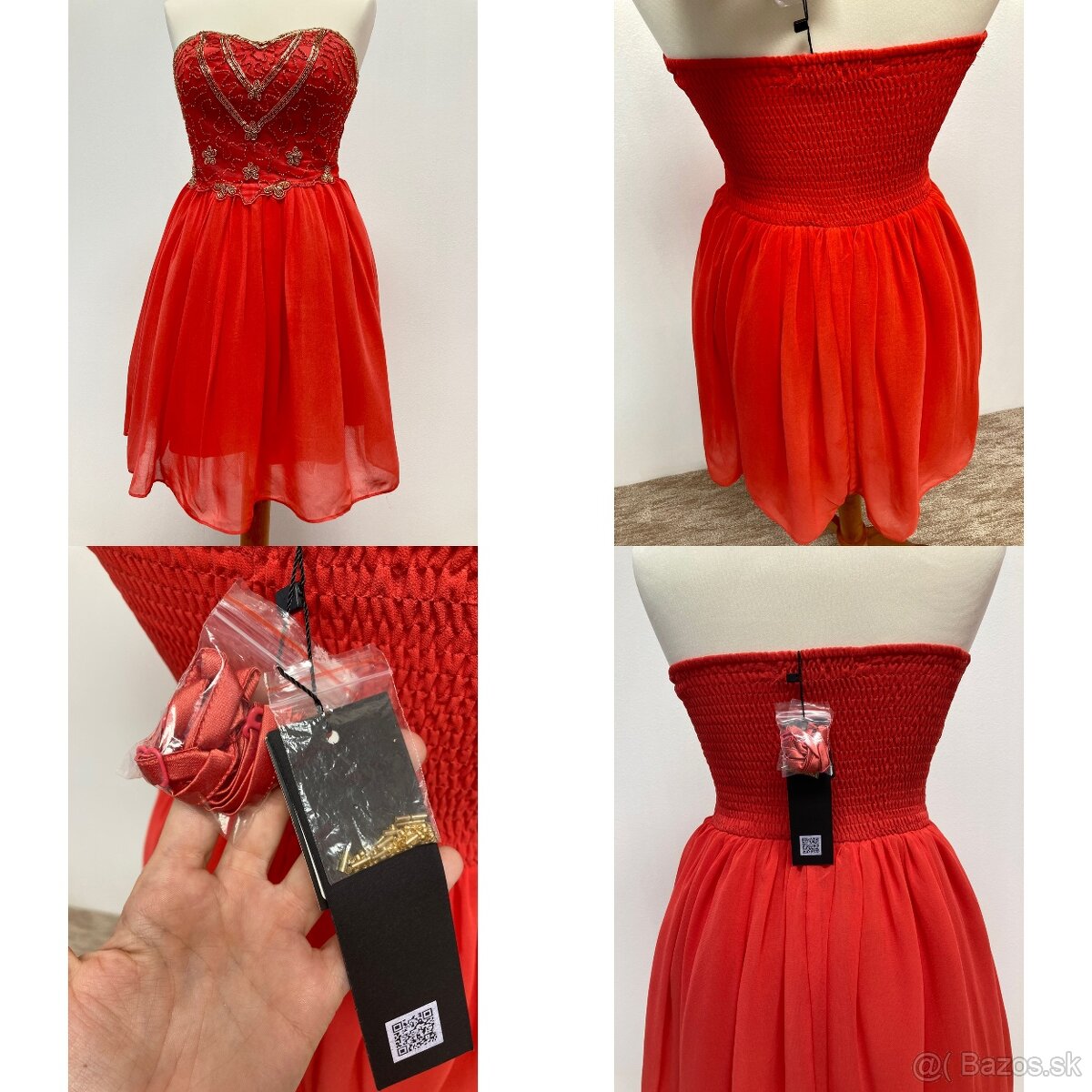 Červené spoločenské šaty 38 - [24.2. 2026]Príjemné, pohodlné a nádherné červené šaty na ramienka, od pása sú voľné, vzadu na zips, majú aj spodničku. Cez prsia je aplikácia kvietkov, vypadá to krásne. Veľkosť 38, zodpovedá, nižšie aj rozmery.