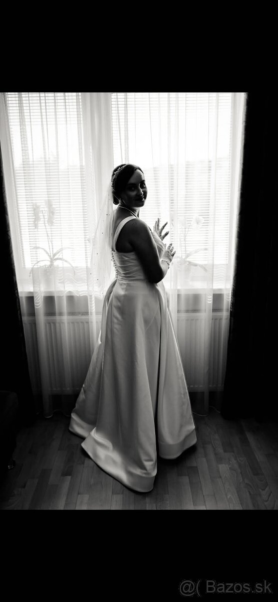 Predám elegantné svadobné šaty šité na mieru. Zapínanie je na zips, šaty majú jemnú vlečku, ktorá dodáva šatám krásny svadobný efekt.