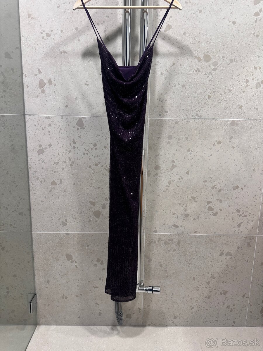 Fialove šaty veľkosť S, celé flitrove a trblietave , v zadu je rozparok a na chrbte zips, 1x oblečené