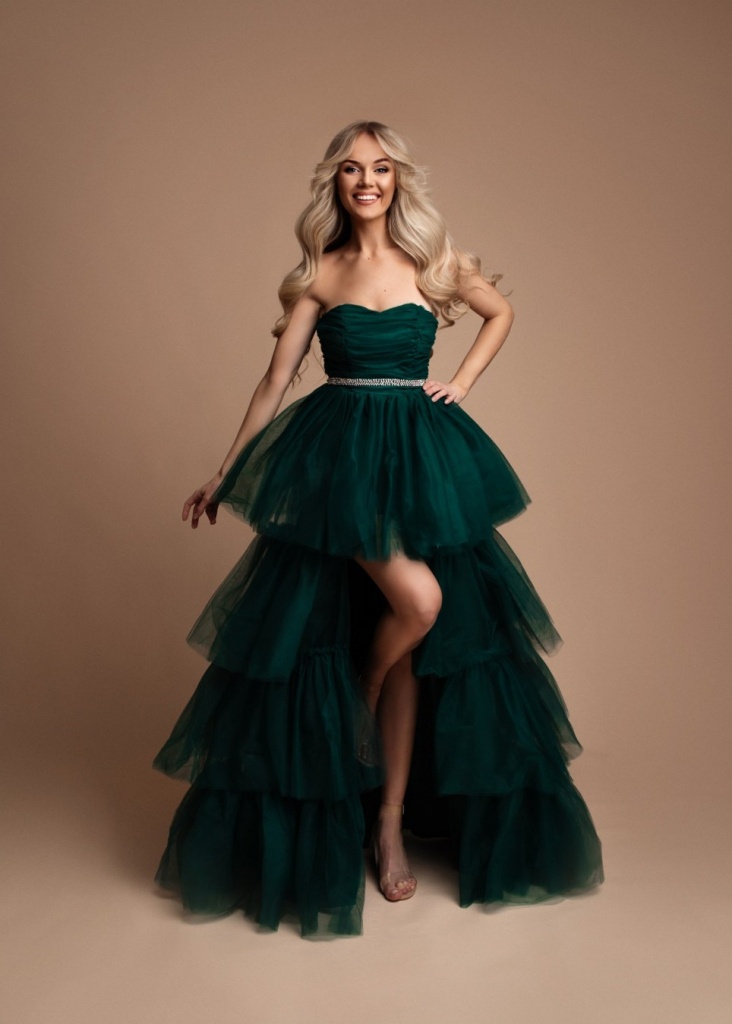 Netradičné tylové spoločenské šaty v nádhernej smaragdovo zelenej sýtej farbe bez ramienok ( je možné pripnúť ramienka - súčasť balenia) Šaty sú mierne elastické vzadu dlhšie, vpredu kratšie. Šaty majú vypchávky a preto je možné ich nosiť aj bez podprsenky. Zapínajú sa zipsom,horná časť sa šnuruje preto je vhodná aj pre veĺkosť od 32 -do 38.