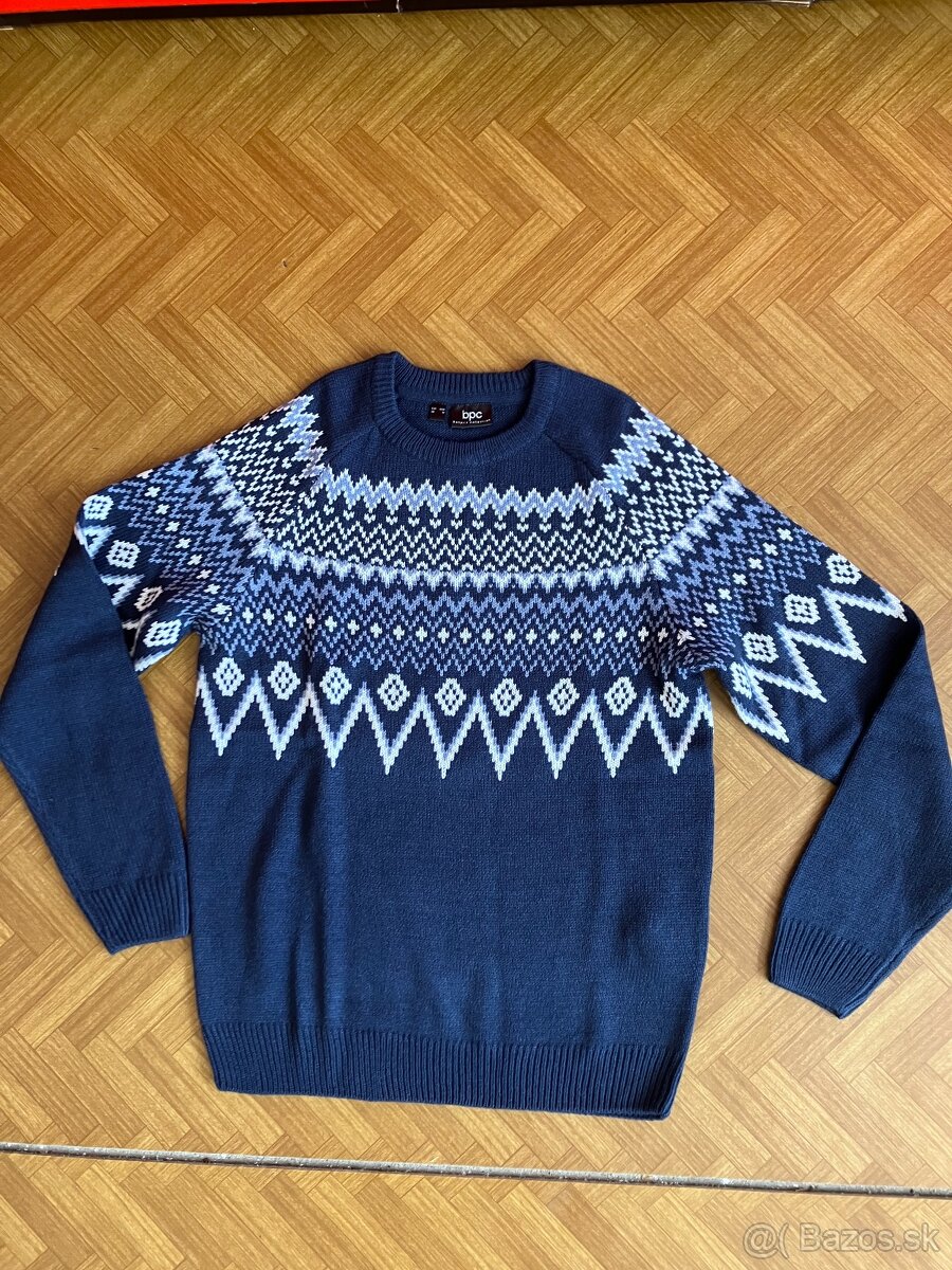Predám nový pánsky pulóver, veľkosť č. M. Presné miery: dĺžka pulóvra - 72 cm, dĺžka rukáva - 59 cm, šírka v ramenách - 41 cm, šírka cez brucho - 102 cm. Pulóver je tmavomodrej farby, s pekným nórskym vzorom. Značka BONPRIX. Cena 14 euro + poštovné.