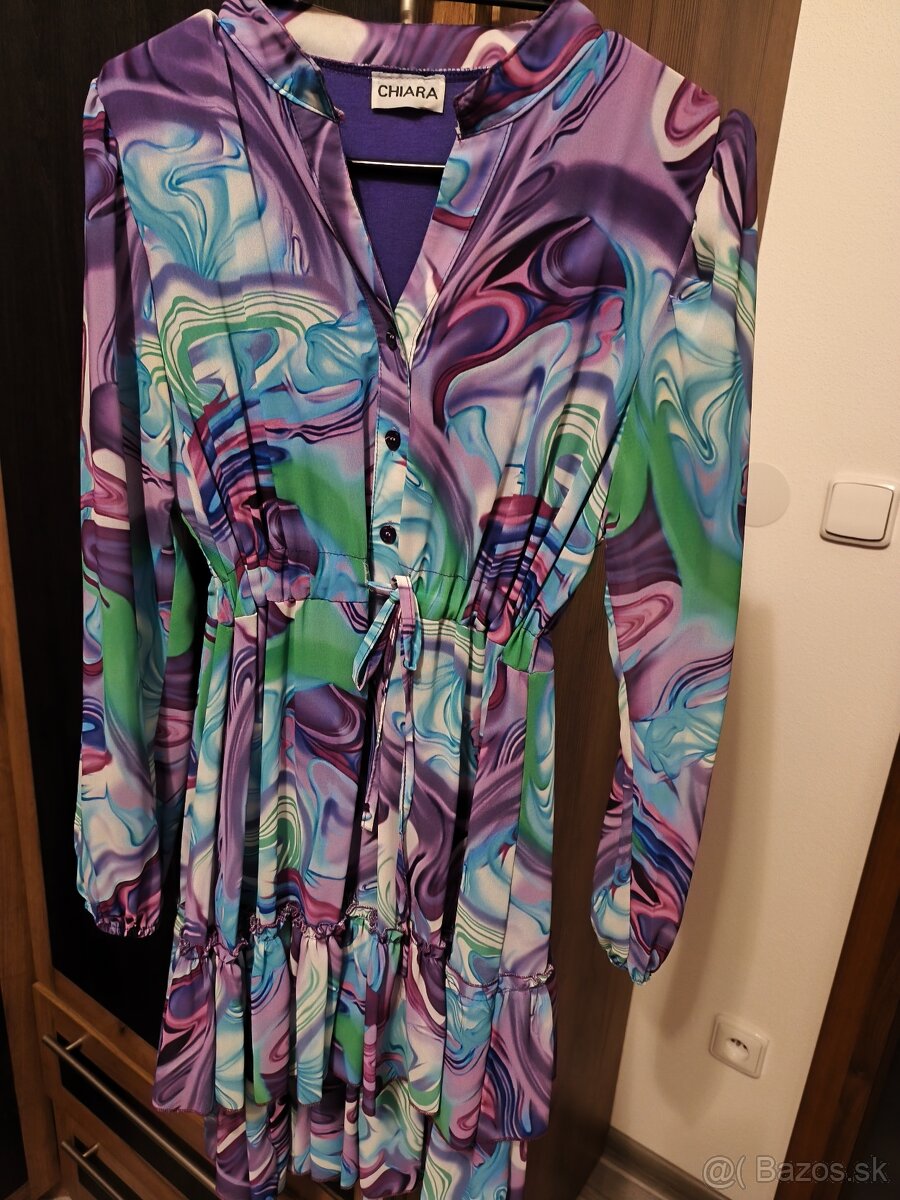 Predám šaty, jeden raz oblečené, Letný materiál, sú farebné, fialová,biela,zelená farba..... veľkosť 38...v páse je šnúrka na stiahnutie