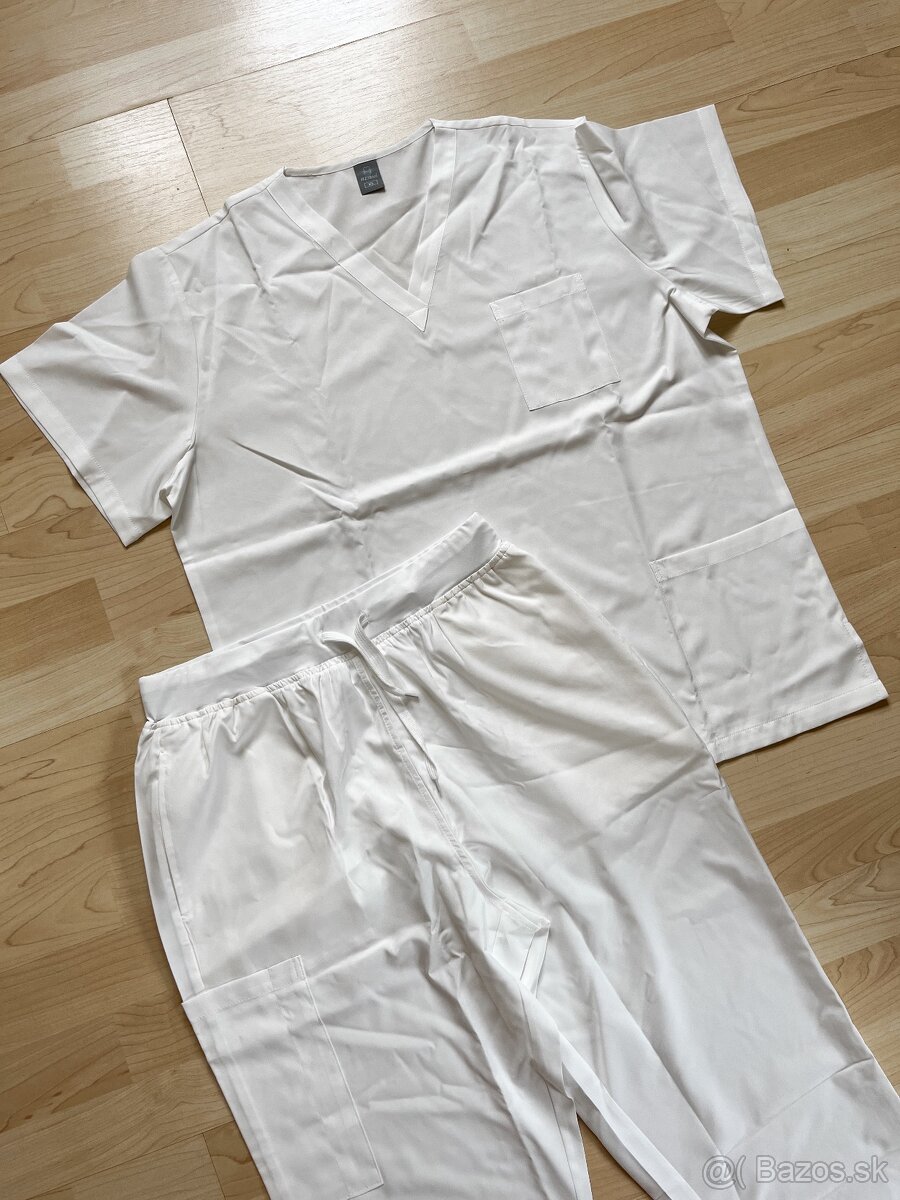 Ponúkam na predaj značkové zdravotnícke oblečenie, set nohavice + blúzka, rozmery na fotkách. Majú vrecká aj na blúzke aj na nohaviciach. Sú nové, nenosené, len vyskúšané. Materiál veľmi ľahký, prijemný na leto (72% polyester, 22% hodváb, 6% spandex). Biely set veľkosť XL, sedí skôr L na plnšiu postavu.