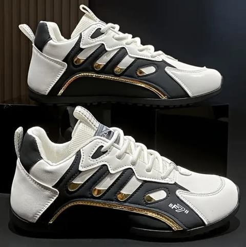 Dámske botasky v čierno bielej kombinácii so zlatými prvkami.