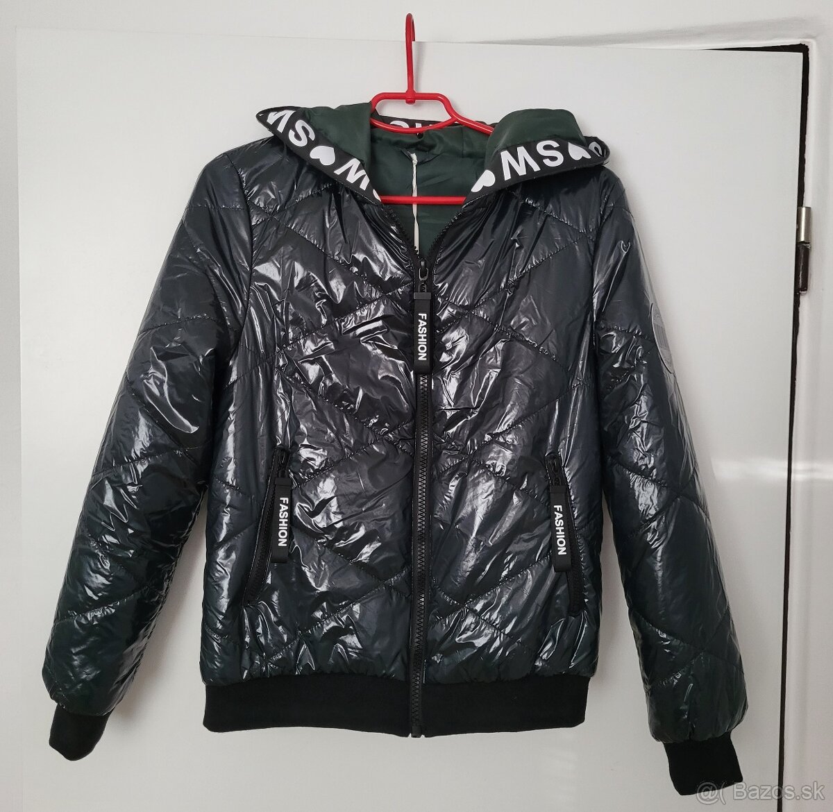 Nová s visačkou, lesklá, tmavozelená farba. Jar/jeseň. Celková dĺžka je 60cm, šírka 48cm, rukáv od ramena 56cm+5cm patent.