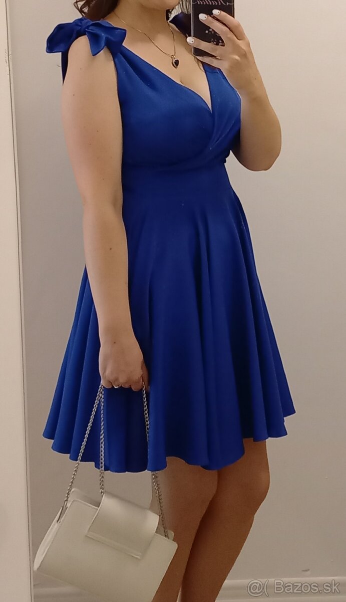 Predám raz oblečené šaty. Farba kráľovská modrá, sukňa áčkového strihu so spodničkou, na ramenách sa viaže, takže obvod na prsiach je možné upraviť, vzadu je zips. Rozmery dĺžka 90 cm, pás 70 cm, hrudník 88-92 cm.