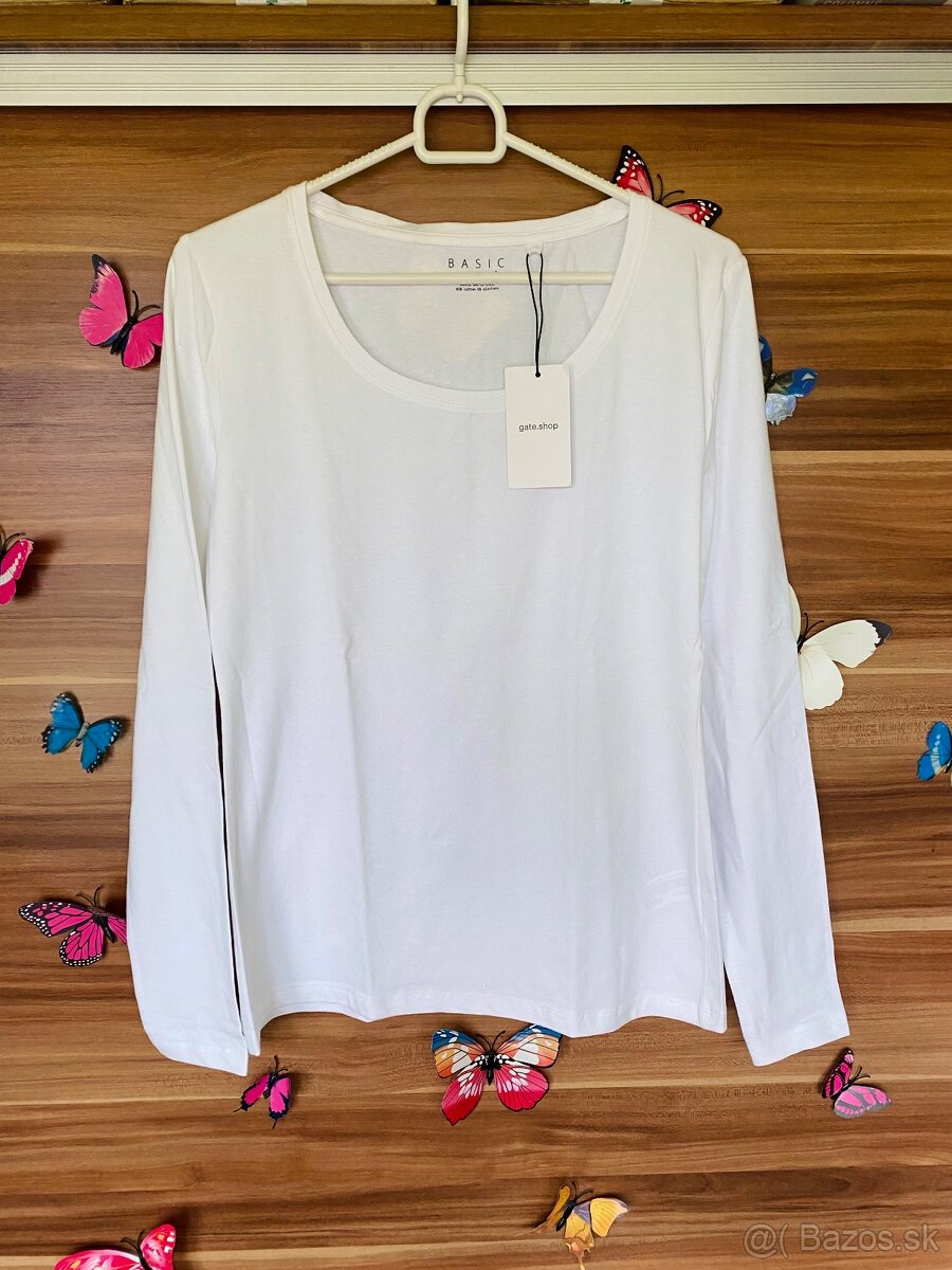 Biele basic tričko s dlhým rukávom, dosť elastické, sadne na M. Mám v šatníku aj iné aj iné biele. Nové