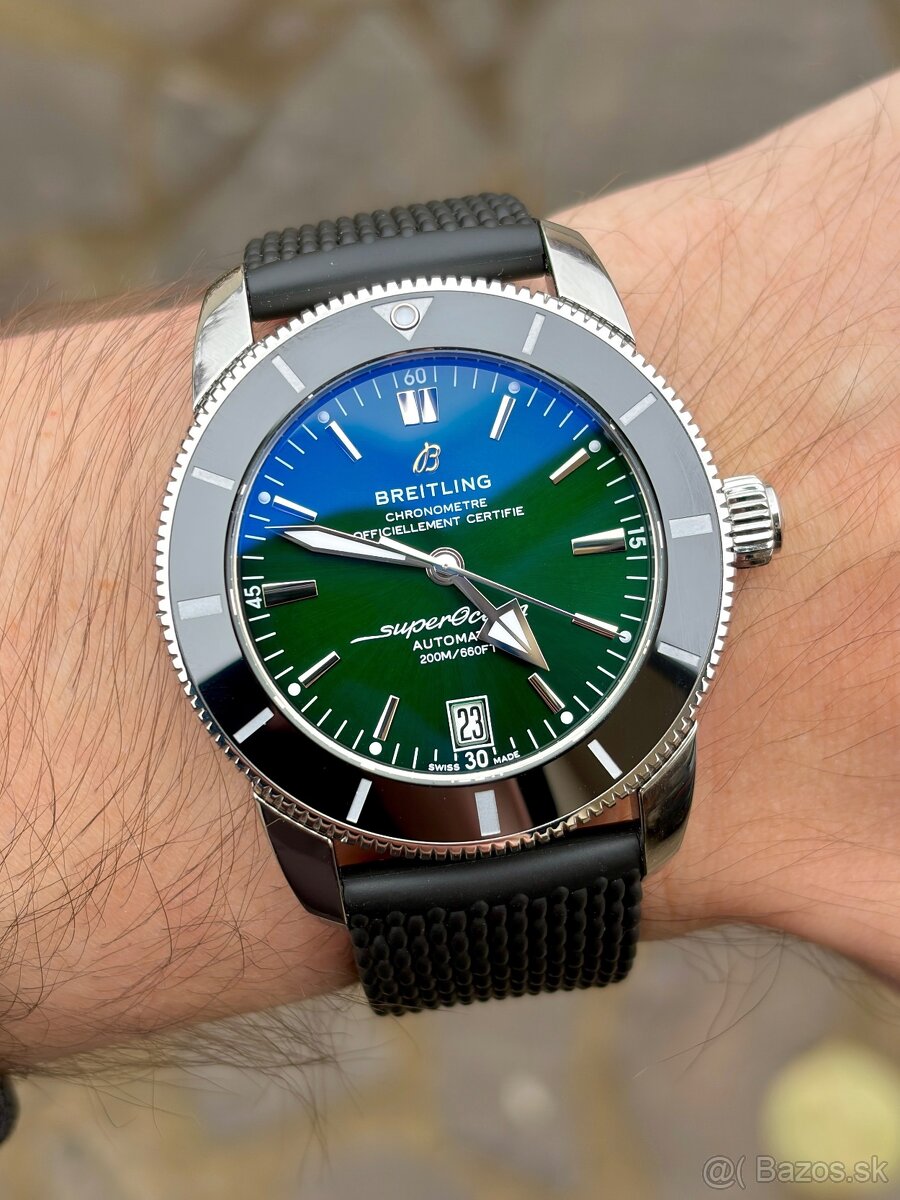 Na predaj automatické hodinky Breitling Superocean Heritage. Ref. AB2010 z r. 2023, 42 mm, keramická luneta, oceľové púzdro s nádherným zeleným ciferníkom, in-house strojček B20, COSC, rezerva chodu ~70 h, zafírové sklíčko s AR, vodotesnosť 200 m. Aktuálne po dvojročnej periodickej kontrole v autorizovanom servise. Továrenská záruka je platná až do konca 2031, takže nový majiteľ si bude môcť hodinky dlho užívať bez akýchkoľvek starostí. Hodinky sú predávané na gume, komplet balenie, NFT mám registrované a prevediem ho pri kúpe. Odber možný SC, prípadne po dohode BA. Viac info rád poskytnem telefonicky alebo cez SMS/WhatsApp.