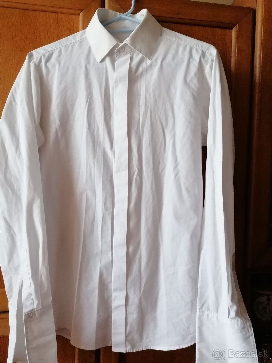 Predám pánsku kvalitnú slimkovú bielu košeľu raz oblečenú. Veľkosť 37/38 na výšku 176/182. Šírka prsia meraná pod pazuchami 100 cm, dlzka rukáva od ramena je 63 cm. Má skryté zapínanie. Rukávy majú manžetu na manžetové gombíky.