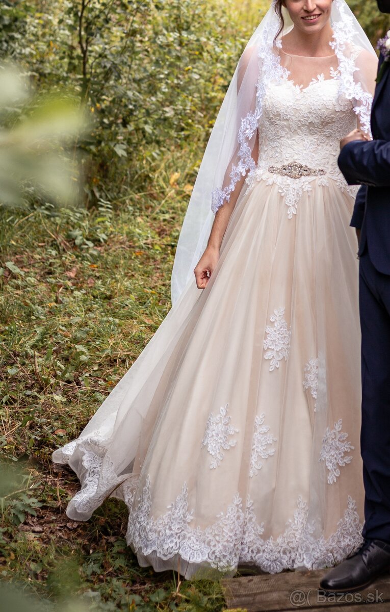 K tomu viem za 50 eur pridať originál krátky závoj v rovnakom prevedení ako šaty (ten som nemala) + dokúpený dlhý biely závoj (na foto) a kruh pod šaty.