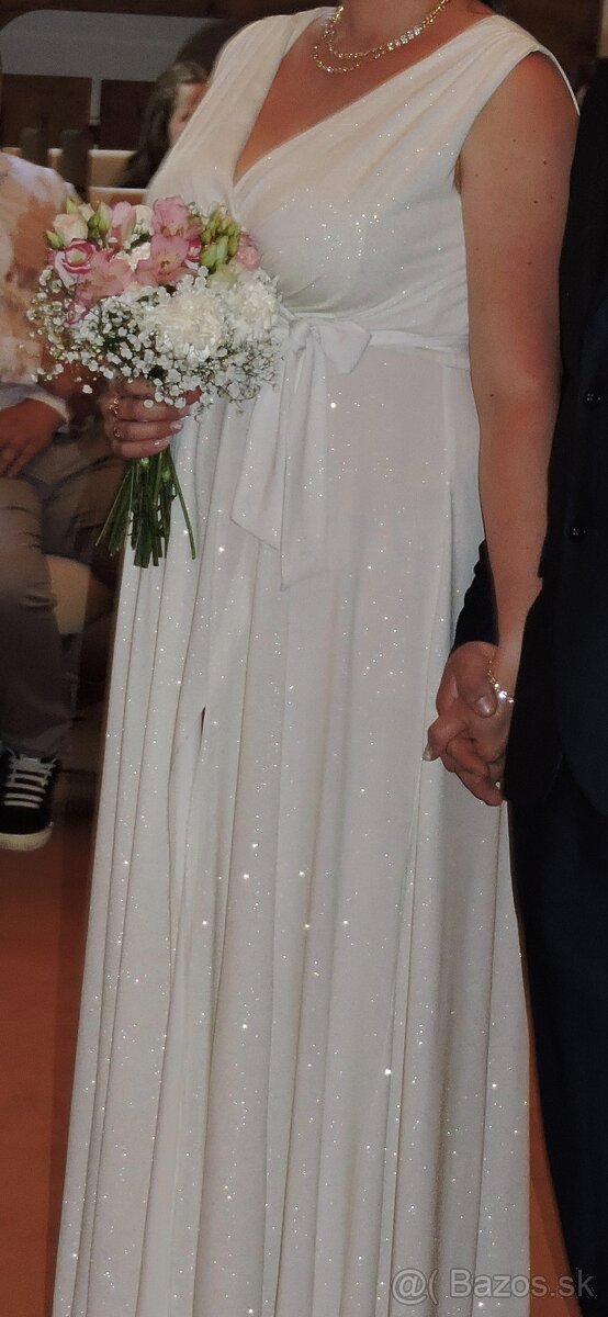 Predám saty, mala som ich ako svadobne na urade, vhodné aj ako polnočné. Farba nieje bielučká ale sampanske. Sú krásne, ľahké, s rozparkom. Cele trblietave. Nebolo.vidno ani tehu bruško a keď som.chcela na foto, vyznelo krásne. Nosím veľkosť L/XL. Moja výška 165cm, obuté som mala tenisky. PC bola 100e. Predám za 50e. Plus posta