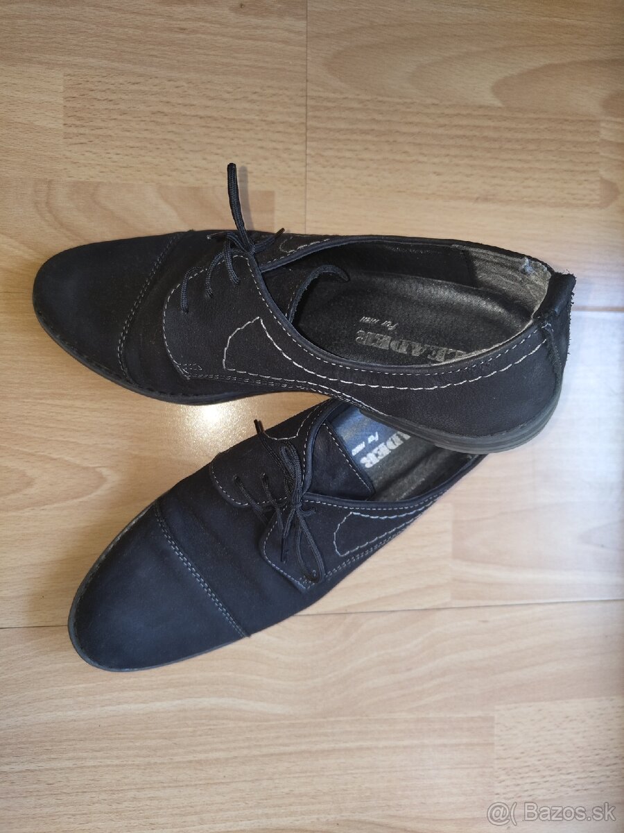 Predám pánske elegantné topánky značky Leader For Men z pravej kože, v čiernej farbe s kontrastným bielym prešívaním. Klasické šnurovanie, pohodlná vnútorná stielka.