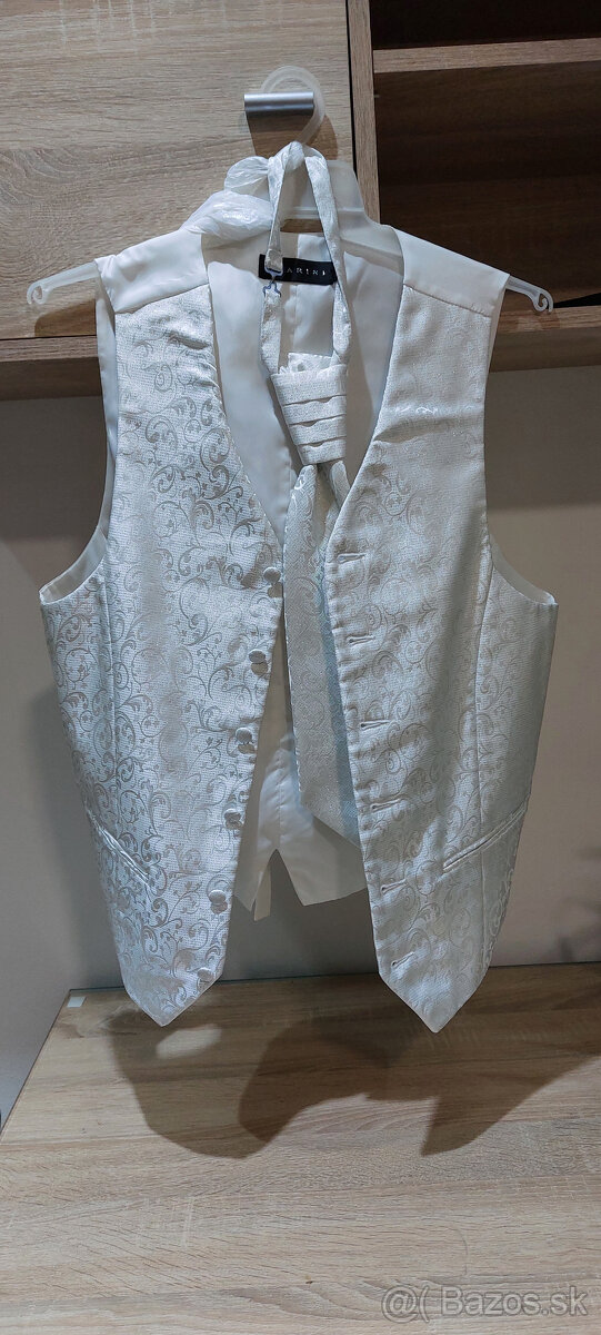 Pánska svadobná vesta - [21.1. 2026]Pánska svadobná vesta biela, veľ. 50, vzadu sťahovacka, francúzska kravata , vreckovka , pekná potlač