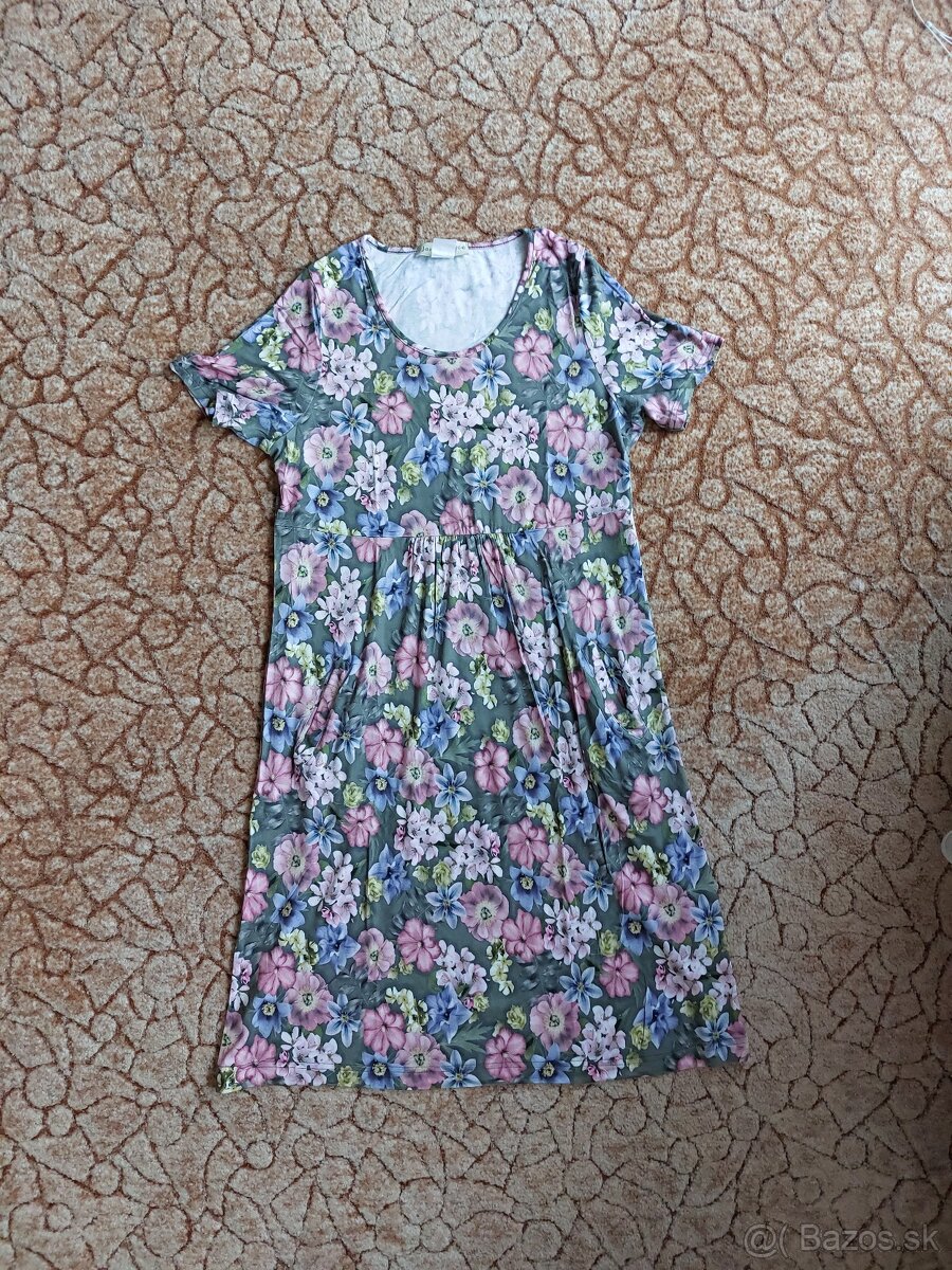 Úpletové šaty, príjemný materiál, krátky rukáv, na bokoch vačky, veľkosť 44, dĺžka 108cm a šírka na prestrihu s riasením 48cm. Na spodok sa dá natiahnuť šnúrka a vytvoriť tak balónový efekt, ja som ju mala vytiahnutú.