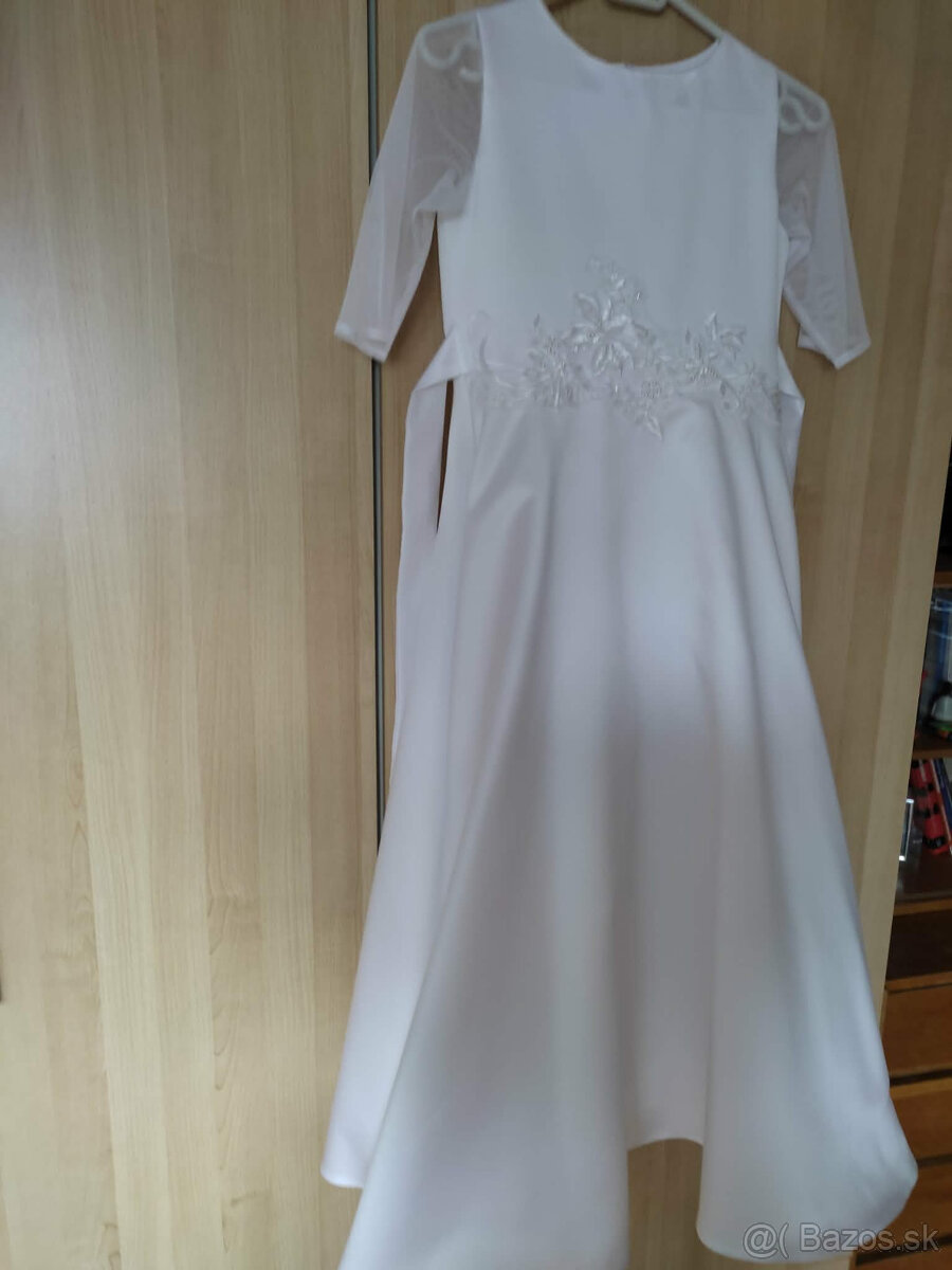 Predám krásne biele saténové šatočky na prvé sv. prijímanie, alebo svadbu. Šatočky sú podšité tvrdšou spodničkou, robia krásny kruh. Rukávy sú trojštvrťové priesvitné. Veľkosť 134. Šatočky sú kupované v butiku- Pôvodná cena 99 euro, teraz 59 euro.