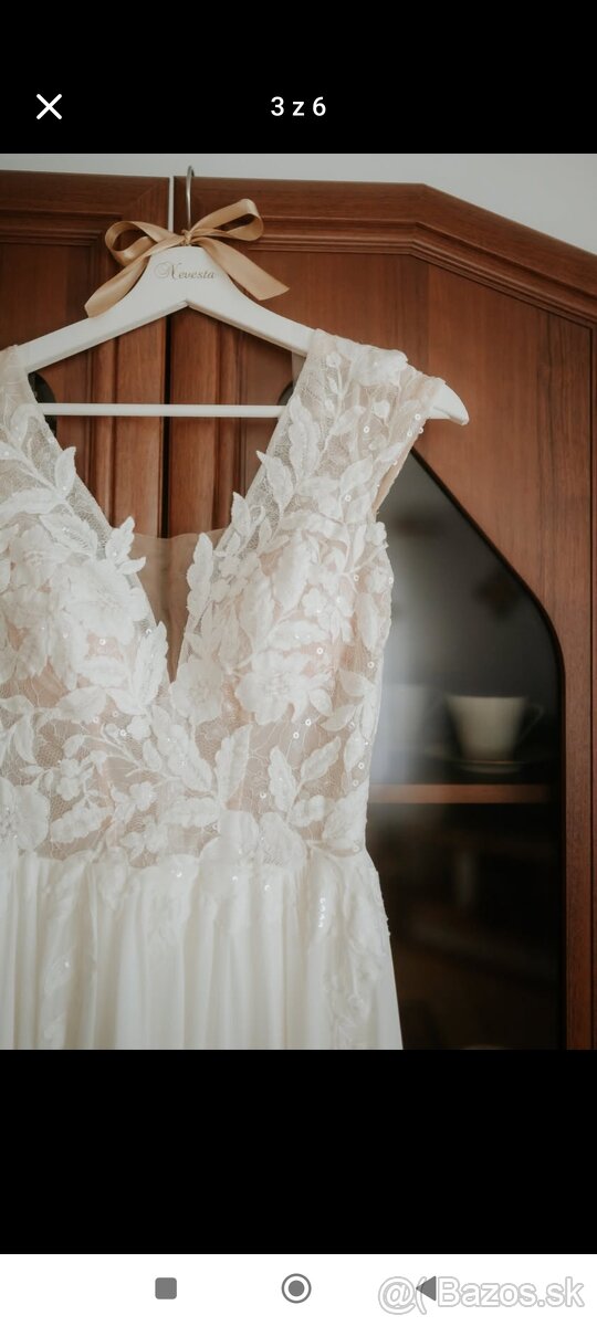 Ponúkam na predaj svadobné šaty, veľkosť S, upravované na XS. Dajú sa povoliť. Majú vystužené prsia, zapínajú sa na zips a gombíky. Pridám k nim aj dlhý závoj.