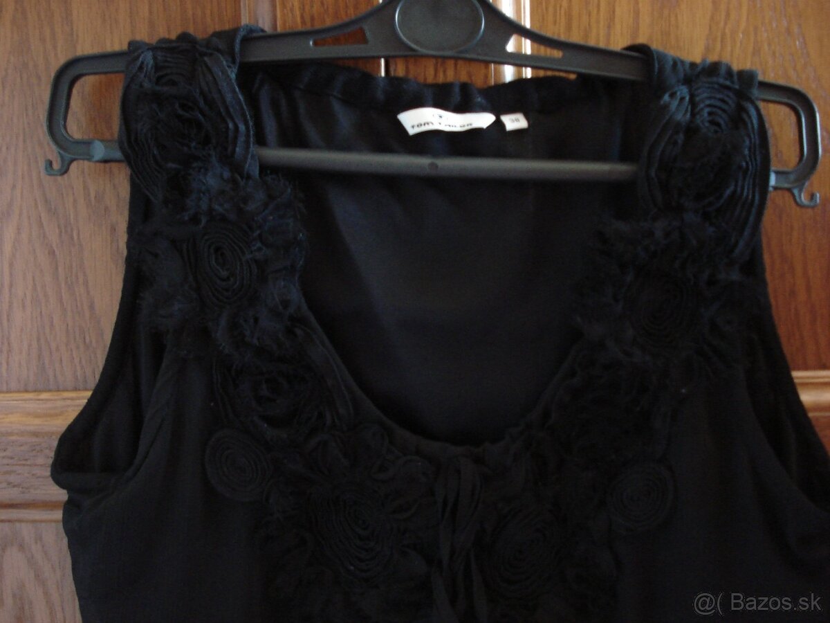 NOVÝ dámsky top čiernej farby, značka Tom Tailor, vpredu v oblasti výstrihu kvety, veľkosť 38, materiál 100% polyester, podšité v prednej aj v zadnej časti.