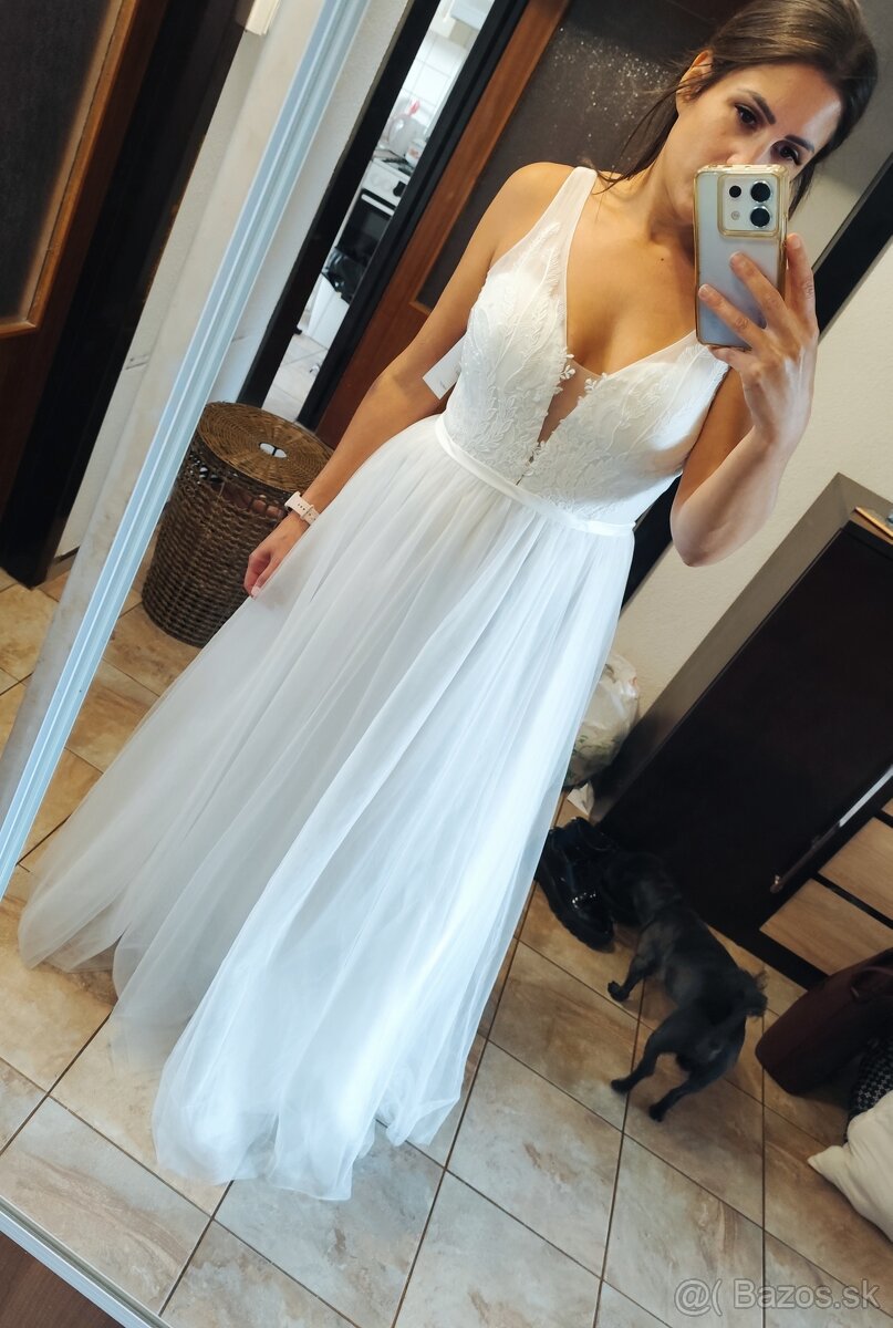 Na mieru šité svadobné šaty veľkosť 36-38 - [9.2. 2026]Predám na mieru šité svadobné šaty strih s úzkym pásom a sukňou do A.