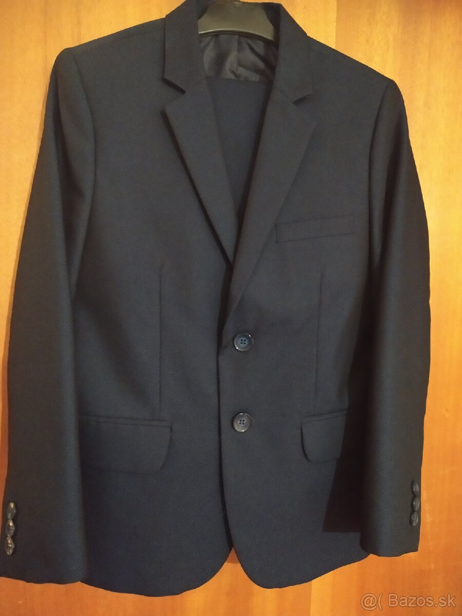 Predám asi 5x oblečený chlapčenský oblek (sako+nohavice) tmavomodrej farby, pre asi 10 ročného šuhaja, my sme ho kupovali na 1. sv. prijímanie, rozmer 140, ale nie je problém premerať, nohavice majú v páse nastaviteľný gumený opasok.