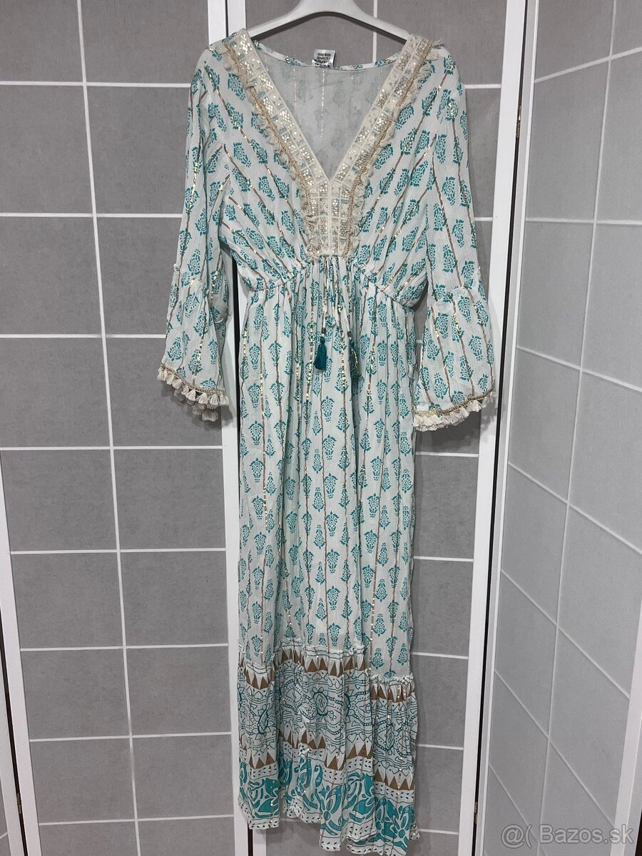 Elegantné plisové zelené šaty L/XL - [7.2. 2026]Predám kúpené a ani raz oblečené dlhé zelené šaty. Šaty majú gumičku v páse, v oblasti bokov sú voľné. Šaty sú mierne elastické. Real farbu vidieť na modelke (foto prevzaté zo stránky obchodu). Na mojich foto farba skresluje.