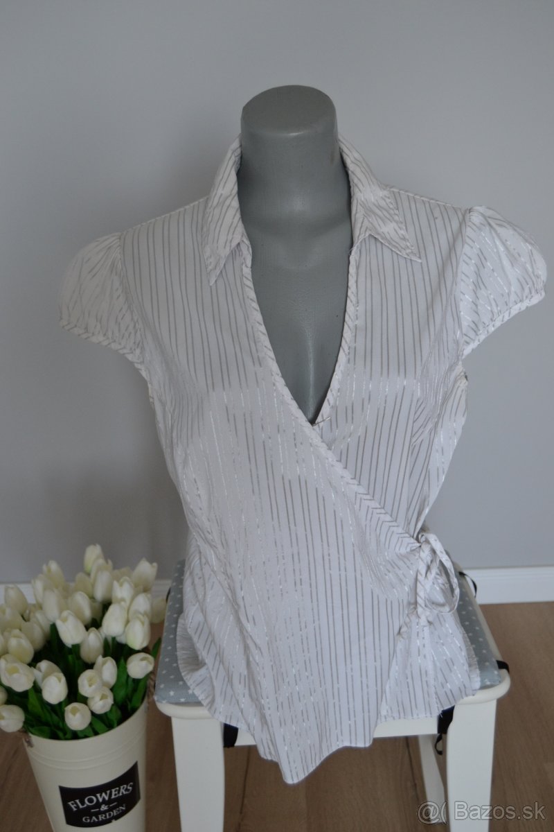 Biela blúzka so striebornými prúžkami, zn. F&F, veľkosť 42, uväzovanie na boku, obvod cez prsia 100 cm, dĺžka 59 cm.