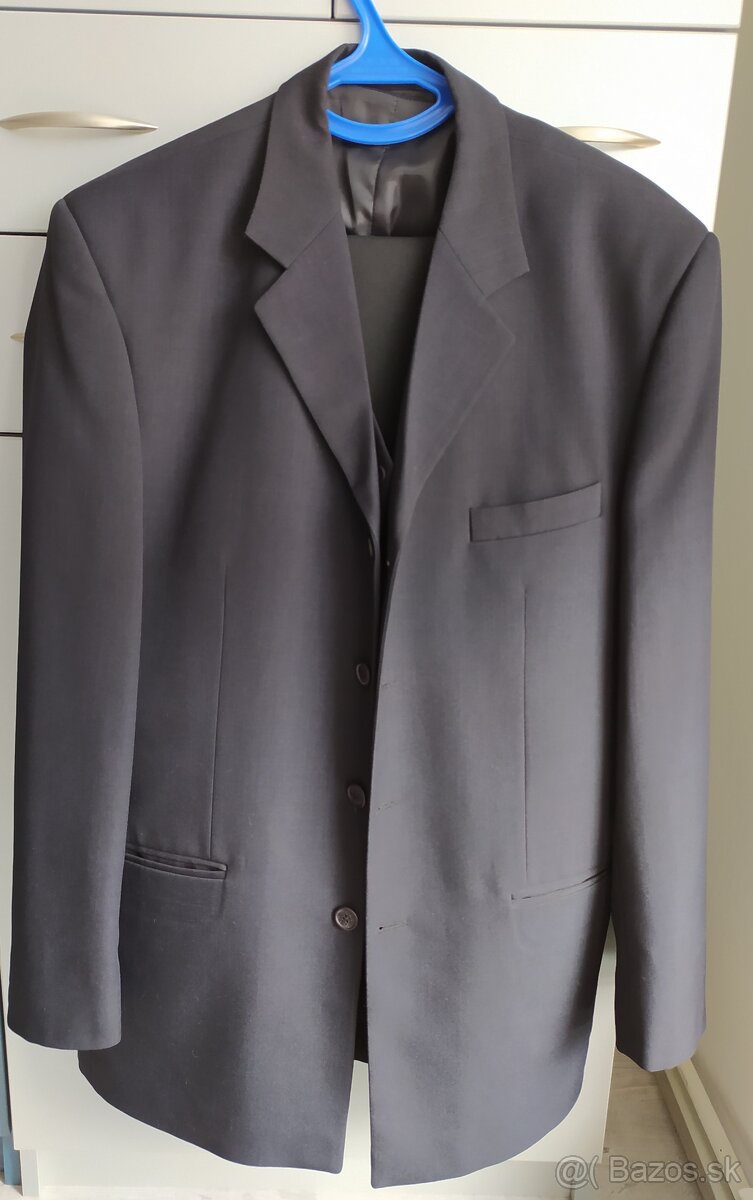 Predám čierny pánsky oblek na výšku cca 180 (50 L) cm - sako (dĺžka chrbta 80 cm), nohavice (dĺžka 105, obvod pása 70-72 cm), vesta